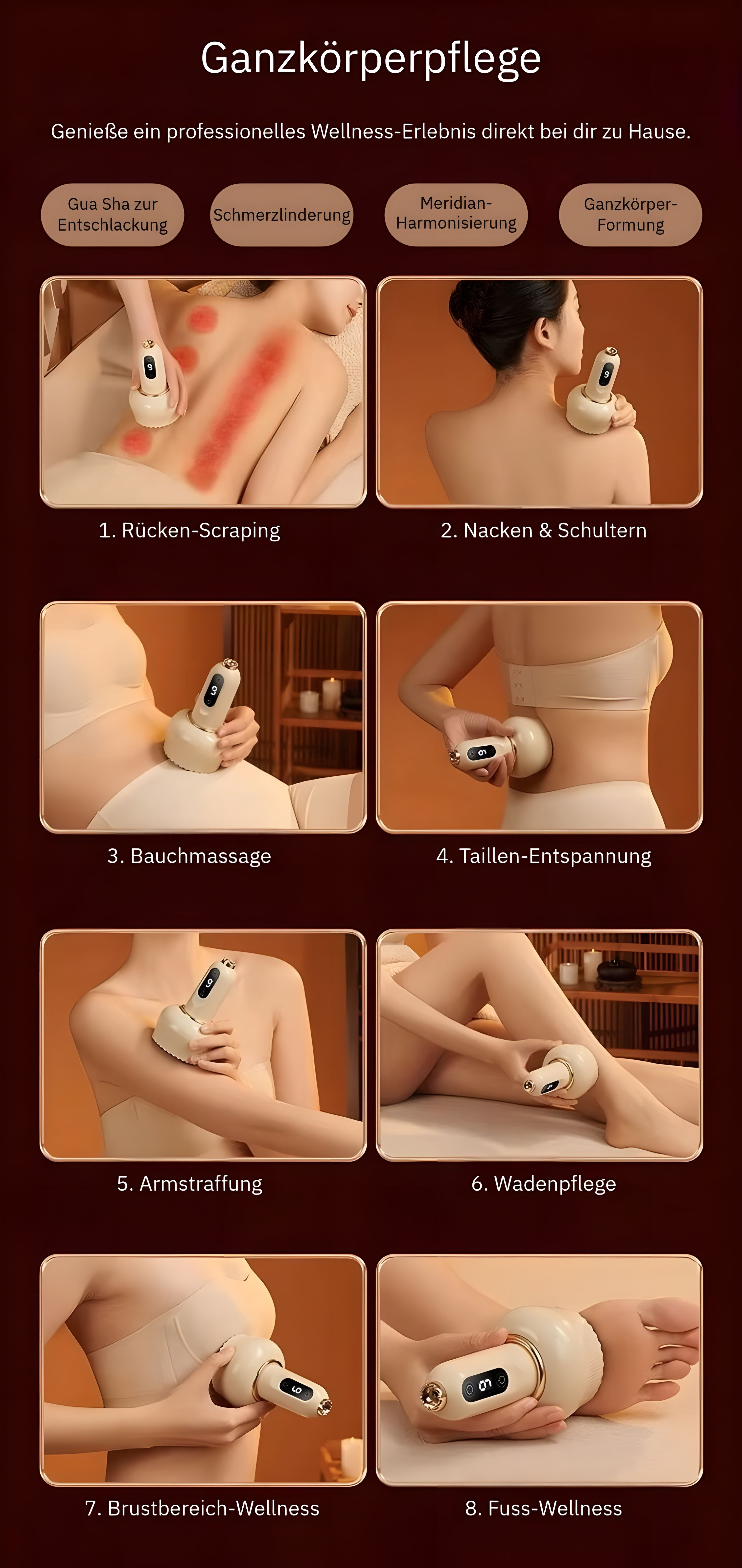 Entdecke die Kraft des modernen Schröpfens. Das Gerät erzeugt ein präzises Vakuum, das die Haut sanft anhebt und so die Durchblutung sowie die Lockerung des Gewebes fördert. Mit 9 einstellbaren Intensitätsstufen (Gears 0-9) kannst du die Saugkraft perfekt an dein Empfinden anpassen – von sanft bis intensiv.
